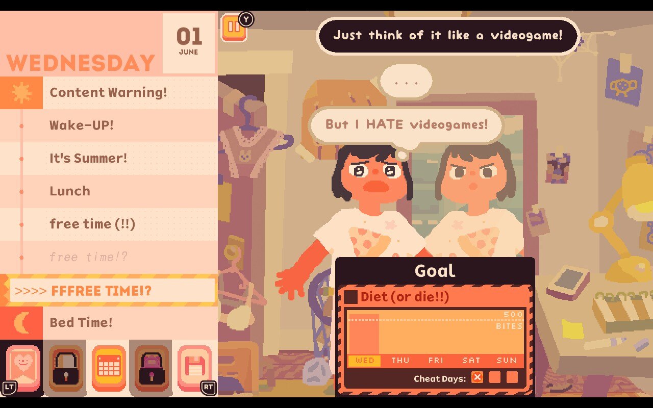 There are some obvious candidates that fall within this lil’ “trend” and at the top of the list has to be Consume Me. Jenny Hsia’s (et. all) work about body image struggles, teenage angst, and trying-and-failing to be your best self employs storytelling minigames so well. Between the button-mashing cutscenes, Tetris-like portion-controlled meals, spider-filled make-up application sequences, and a whole slew of other short-but-sweet mechanics (that’s a lot of hyphenated phrases), Consume Me uses minigames to convey the hectic and scatterbrained challenges that teenagers face, especially when trying to assert their identities within overbearing traditional family units. Though the game also employs standard dialog, monologue, description, and other visual storytelling motifs, the emotional thrust of the game comes from the rapid succession of tasks the player must perform and choose to meet a growing pile of social and self-care goals. As the house-of-cards of self-improvement collapses, and the toxic side of dieting and beauty standards takes full shape, the player-character finds catharsis in almost “under-performing” these minigames, instead opting to find solace in the journey of self-care rather than the result.